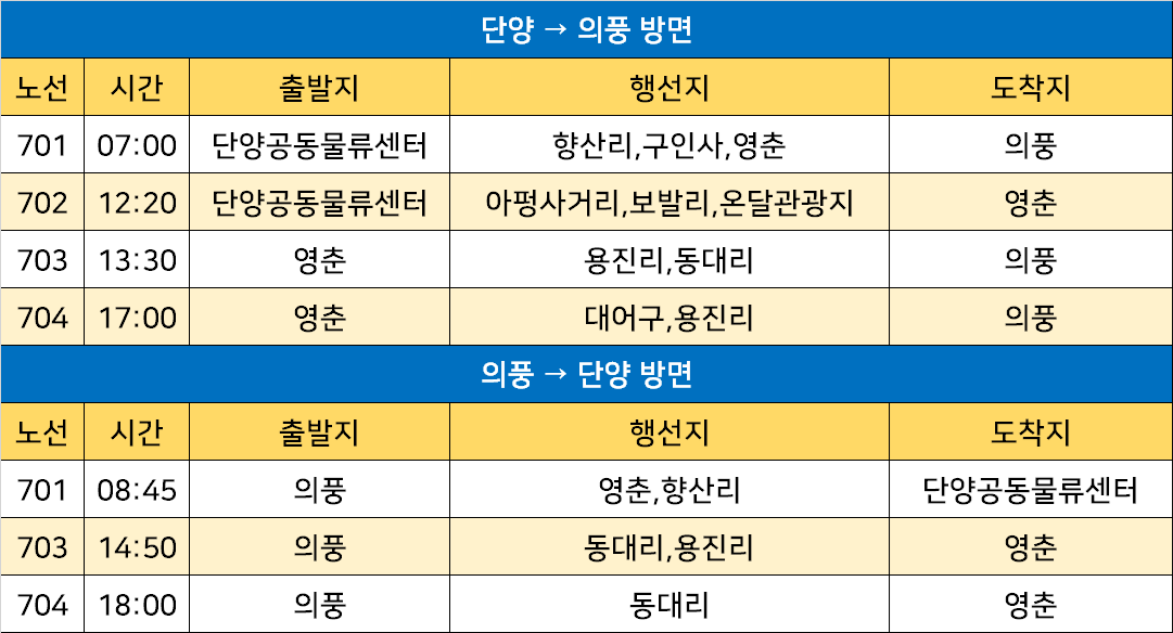 단양 700번대 노선: 단양 ↔ 의풍, 구인사, 단양공동물류센터, 대어구, 동대리, 보발리, 아펑사거리, 영춘, 온달관광지, 용진리, 의풍, 향산리