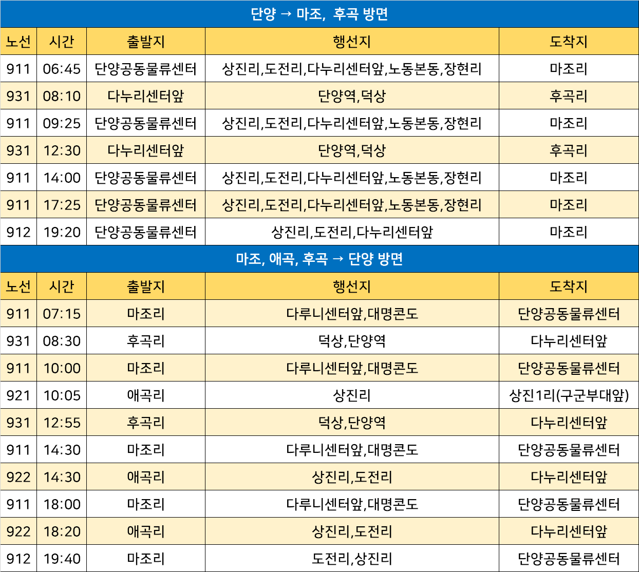단양 900번대 노선: 마조, 애곡, 후곡 ↔ 단양, 노동본동, 다누리센터앞, 다루니센터앞, 단양공동물류센터, 단양역, 대명콘도, 덕상, 도전리, 마조리, 상진1리(구군부대앞), 상진리, 애곡리, 장현리, 후곡리