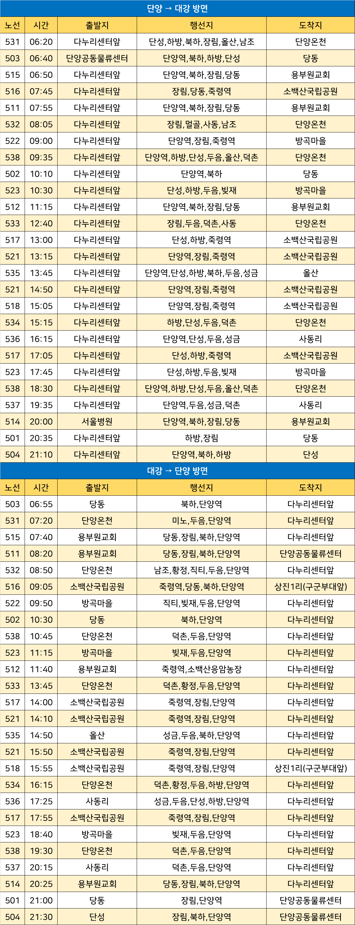 단양 500번대 노선: 단양 ↔ 대강, 남조, 다누리센터앞, 단성, 단양공동물류센터, 단양역, 단양온천, 당동, 덕촌, 두음, 멀골, 미노, 방곡마을, 북하, 빚재, 사동, 사동리, 상진1리(구군부대앞), 서울병원, 성금, 소백산국립공원, 소백산응암농장, 올산, 용부원교회, 장림, 죽령역, 직티, 하방, 황정