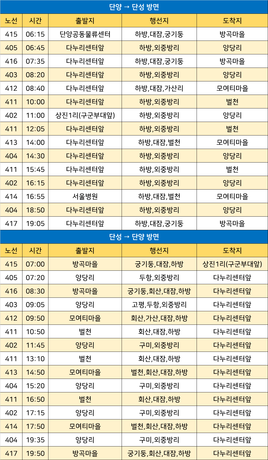 단양 400번대 노선: 단양 ↔ 단성, 가산리, 고평, 구미, 궁기둥, 다누리센터앞, 단양공동물류센터, 대잠, 두항, 모여티마을, 방곡마을, 벌천, 상진1리(구군부대앞), 서울병원, 양당리, 외중방리, 하방, 회산