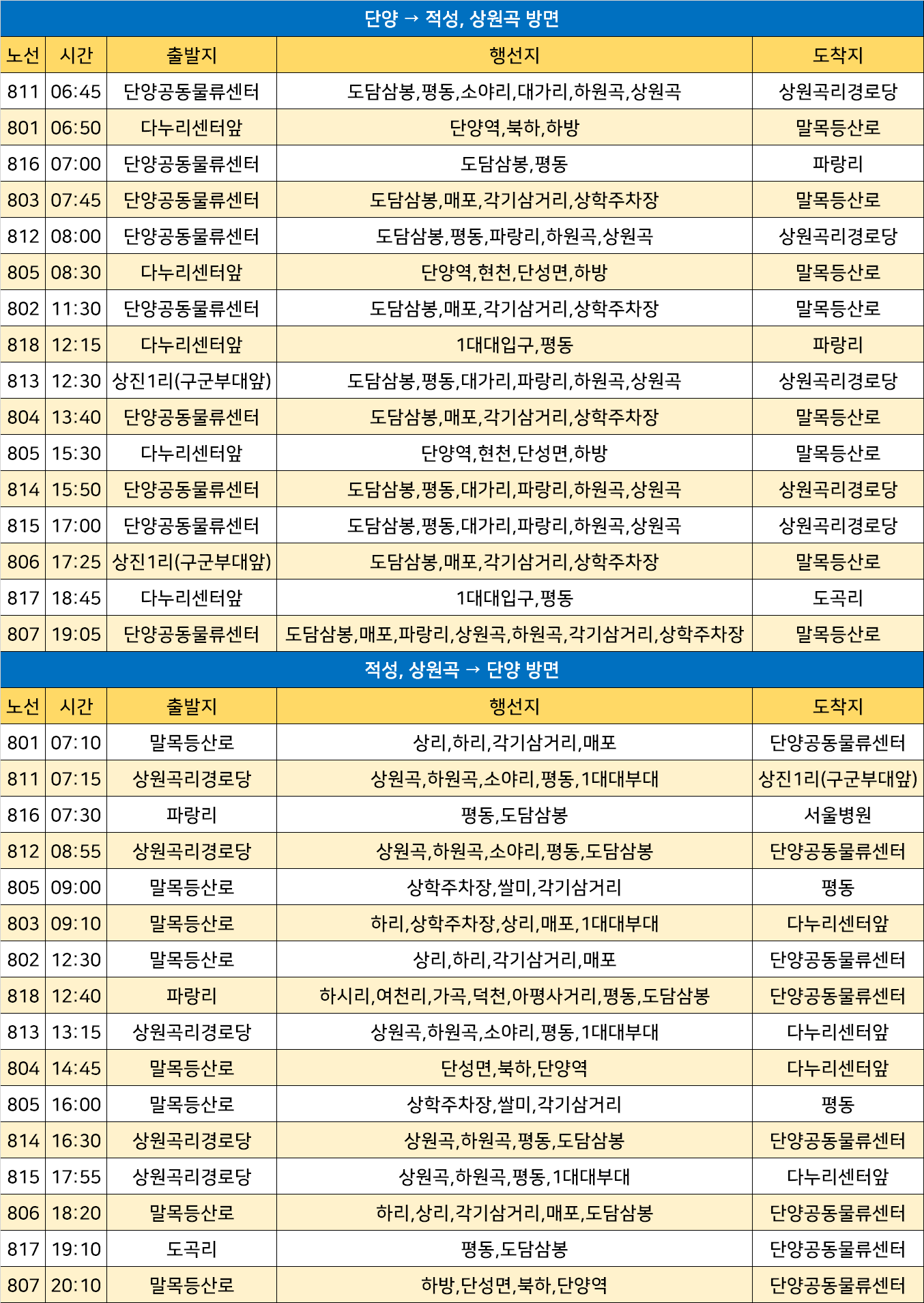 단양 800번대 노선: 적성, 상원곡 ↔ 단양, 1대대부대, 1대대입구, 가곡, 각기삼거리, 다누리센터앞, 단성면, 단양공동물류센터, 단양역, 대가리, 덕천, 도곡리, 도담삼봉, 말목등산로, 매포, 북하, 상리, 상원곡, 상원곡리경로당, 상진1리(구군부대앞), 상학주차장, 서울병원, 소야리, 쌀미, 아평사거리, 여천리, 파랑리, 평동, 하리, 하방, 하시리, 하원곡, 현천