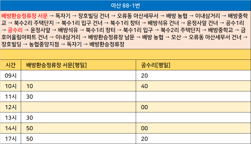아산 88-1번: 배방환승정류장 서문 → 독자기 → 장호빌딩 건너 → 오류동 아산세무서 → 배방 농협 → 이내삼거리 → 배방중학교 → 북수2리 주택단지 → 북수1리 입구 건너 → 북수1리 창터 → 배방석유 건너 → 윤정사앞 건너 → 공수1리 → 공수리 → 윤정사앞 → 배방석유 → 북수1리 창터 → 북수1리 입구 → 북수2리 주택단지 → 배방중학교 → 금호어울림아파트 건너 → 이내삼거리 → 배방환승정류장 남문 → 배방 농협 → 모산 → 오류동 아산세무서 건너 → 장호빌딩 → 농협중앙지점 → 독자기 → 배방환승정류장