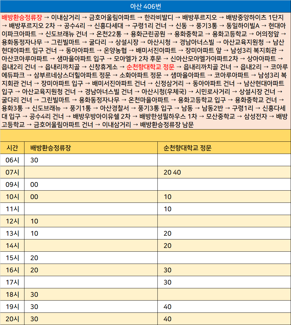 아산 406번: 배방환승정류장 → 이내삼거리 → 금호어울림아파트 → 한라비발디 → 배방푸르지오 → 배방중앙하이츠 1단지 → 배방푸르지오 2차 → 공수4리 → 신흥다세대 → 구령1리 건너 → 신동 → 풍기3통 → 동일하이빌A → 현대아이파크아파트 → 신도브래뉴 건너 → 온천22통 → 용화근린공원 → 용화중학교 → 용화고등학교 → 어의정앞 → 용화동정자나무 → 그린빌마트 → 굴다리 → 상설시장 → 아산시청 → 경남아너스빌 → 아산교육지원청 → 남산현대아파트 입구 건너 → 동아아파트 → 온양농협 → 배미서진아파트 → 장미아파트 앞 → 남성3리 복지회관 → 아산코아루아파트 → 샘마을아파트 입구 → 모아엘가 2차 후문 → 신아산모아엘가아파트2차 → 상아아파트 → 읍내2리 건너 → 읍내리까치골 → 신창휴게소 → 순천향대학교 정문 → 읍내리까치골 건너 → 읍내2리 → 코아루에듀파크 → 삼부르네상스더힐아파트 정문 → 소화아파트 정문 → 샘마을아파트 → 코아루아파트 → 남성3리 복지회관 건너 → 장미아파트 입구 → 배미서진아파트 건너 → 신정삼거리 → 동아아파트 건너 → 남산현대아파트 입구 → 아산교육지원청 건너 → 경남아너스빌 건너 → 아산시청(우체국) → 시민로사거리 → 상설시장 건너 → 굴다리 건너 → 그린빌마트 → 용화동정자나무 → 온천마을아파트 → 용화고등학교 입구 → 용화중학교 건너 → 용화3통 → 신도브래뉴 → 풍기1통 → 아산경찰서 → 풍기3통 입구 → 남동 → 남동2반 → 구령1리 → 신흥다세대 입구 → 공수4리 건너 → 배방우방아이유쉘 2차 → 배방한성필하우스 1차 → 모산중학교 → 삼성전자 → 배방고등학교 → 금호어울림아파트 건너 → 이내삼거리 → 배방환승정류장 남문
