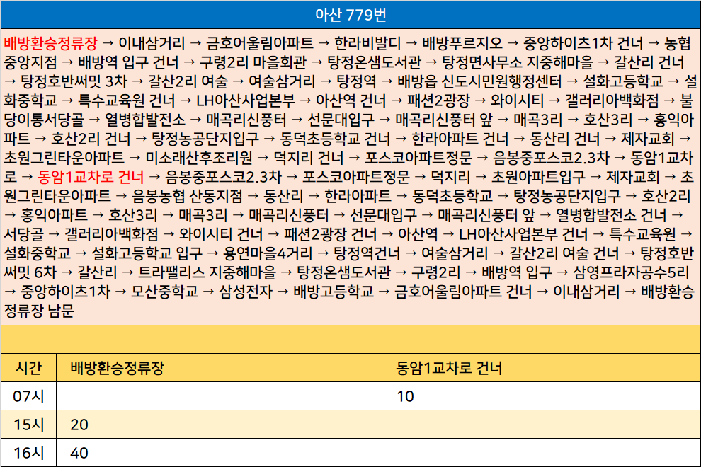 아산 779번: 배방환승정류장 → 이내삼거리 → 금호어울림아파트 → 한라비발디 → 배방푸르지오 → 중앙하이츠1차 건너 → 농협중앙지점 → 배방역 입구 건너 → 구령2리 마을회관 → 탕정온샘도서관 → 탕정면사무소 지중해마을 → 갈산리 건너 → 탕정호반써밋 3차 → 갈산2리 여술 → 여술삼거리 → 탕정역 → 배방읍 신도시민원행정센터 → 설화고등학교 → 설화중학교 → 특수교육원 건너 → LH아산사업본부 → 아산역 건너 → 패션2광장 → 와이시티 → 갤러리아백화점 → 불당이통서당골 → 열병합발전소 → 매곡리신풍터 → 선문대입구 → 매곡리신풍터 앞 → 매곡3리 → 호산3리 → 홍익아파트 → 호산2리 건너 → 탕정농공단지입구 → 동덕초등학교 건너 → 한라아파트 건너 → 동산리 건너 → 제자교회 → 초원그린타운아파트 → 미소래산후조리원 → 덕지리 건너 → 포스코아파트정문 → 음봉중포스코2.3차 → 동암1교차로 → 동암1교차로 건너 → 음봉중포스코2.3차 → 포스코아파트정문 → 덕지리 → 초원아파트입구 → 제자교회 → 초원그린타운아파트 → 음봉농협 산동지점 → 동산리 → 한라아파트 → 동덕초등학교 → 탕정농공단지입구 → 호산2리 → 홍익아파트 → 호산3리 → 매곡3리 → 매곡리신풍터 → 선문대입구 → 매곡리신풍터 앞 → 열병합발전소 건너 → 서당골 → 갤러리아백화점 → 와이시티 건너 → 패션2광장 건너 → 아산역 → LH아산사업본부 건너 → 특수교육원 → 설화중학교 → 설화고등학교 입구 → 용연마을4거리 → 탕정역건너 → 여술삼거리 → 갈산2리 여술 건너 → 탕정호반써밋 6차 → 갈산리 → 트라팰리스 지중해마을 → 탕정온샘도서관 → 구령2리 → 배방역 입구 → 삼영프라자공수5리 → 중앙하이츠1차 → 모산중학교 → 삼성전자 → 배방고등학교 → 금호어울림아파트 건너 → 이내삼거리 → 배방환승정류장 남문
