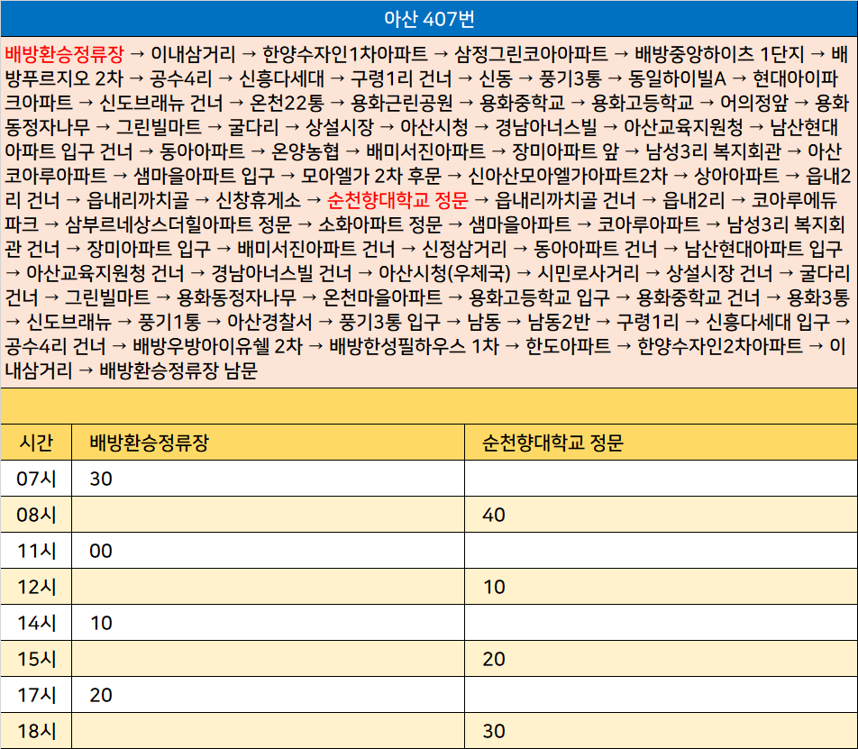아산 407번: 배방환승정류장 → 이내삼거리 → 한양수자인1차아파트 → 삼정그린코아아파트 → 배방중앙하이츠 1단지 → 배방푸르지오 2차 → 공수4리 → 신흥다세대 → 구령1리 건너 → 신동 → 풍기3통 → 동일하이빌A → 현대아이파크아파트 → 신도브래뉴 건너 → 온천22통 → 용화근린공원 → 용화중학교 → 용화고등학교 → 어의정앞 → 용화동정자나무 → 그린빌마트 → 굴다리 → 상설시장 → 아산시청 → 경남아너스빌 → 아산교육지원청 → 남산현대아파트 입구 건너 → 동아아파트 → 온양농협 → 배미서진아파트 → 장미아파트 앞 → 남성3리 복지회관 → 아산코아루아파트 → 샘마을아파트 입구 → 모아엘가 2차 후문 → 신아산모아엘가아파트2차 → 상아아파트 → 읍내2리 건너 → 읍내리까치골 → 신창휴게소 → 순천향대학교 정문 → 읍내리까치골 건너 → 읍내2리 → 코아루에듀파크 → 삼부르네상스더힐아파트 정문 → 소화아파트 정문 → 샘마을아파트 → 코아루아파트 → 남성3리 복지회관 건너 → 장미아파트 입구 → 배미서진아파트 건너 → 신정삼거리 → 동아아파트 건너 → 남산현대아파트 입구 → 아산교육지원청 건너 → 경남아너스빌 건너 → 아산시청(우체국) → 시민로사거리 → 상설시장 건너 → 굴다리 건너 → 그린빌마트 → 용화동정자나무 → 온천마을아파트 → 용화고등학교 입구 → 용화중학교 건너 → 용화3통 → 신도브래뉴 → 풍기1통 → 아산경찰서 → 풍기3통 입구 → 남동 → 남동2반 → 구령1리 → 신흥다세대 입구 → 공수4리 건너 → 배방우방아이유쉘 2차 → 배방한성필하우스 1차 → 한도아파트 → 한양수자인2차아파트 → 이내삼거리 → 배방환승정류장 남문