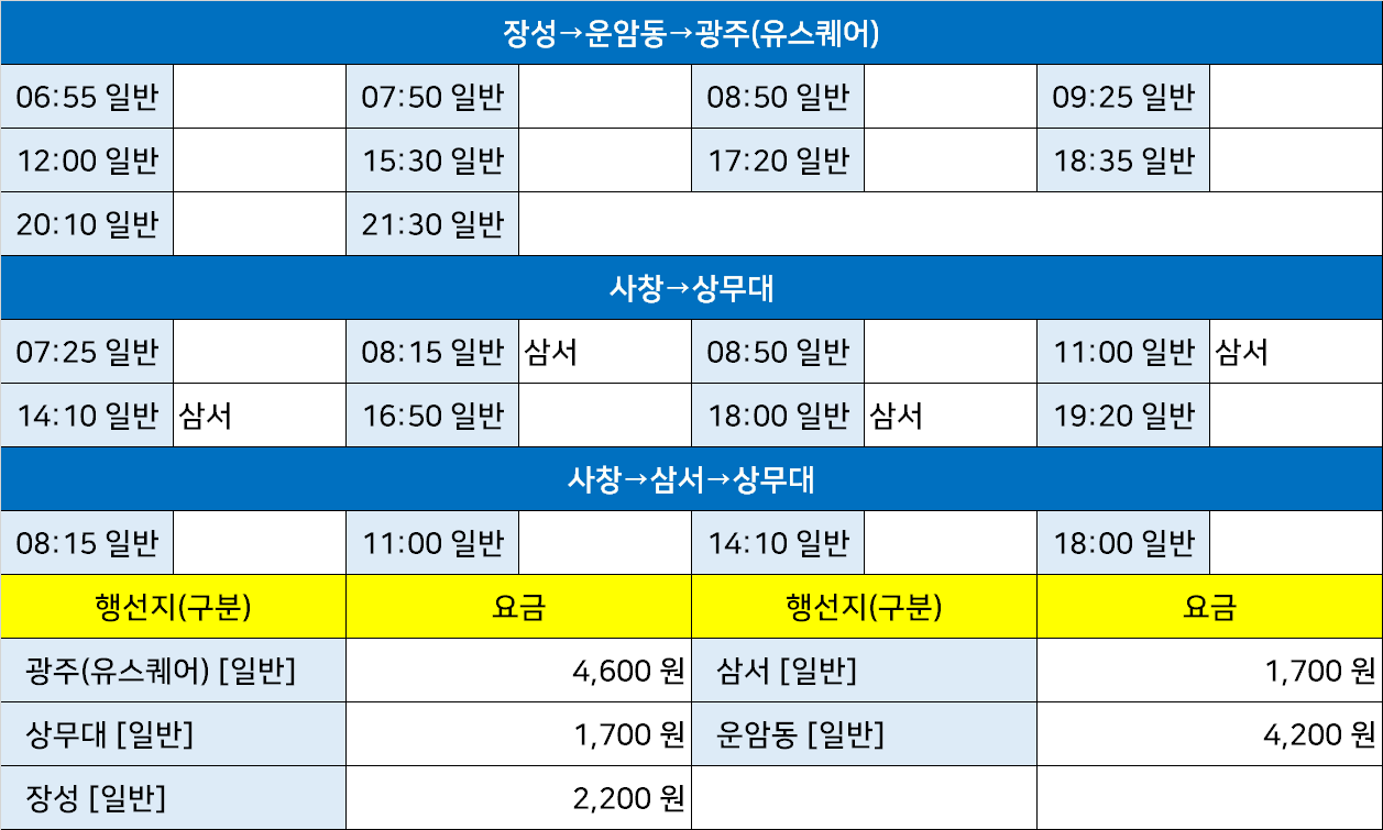 상무아파트시외버스정류장 상무아파트버스정류장 상무아파트정류장 → "사창→삼서→상무대,사창→상무대,장성→운암동→광주(유스퀘어)".
