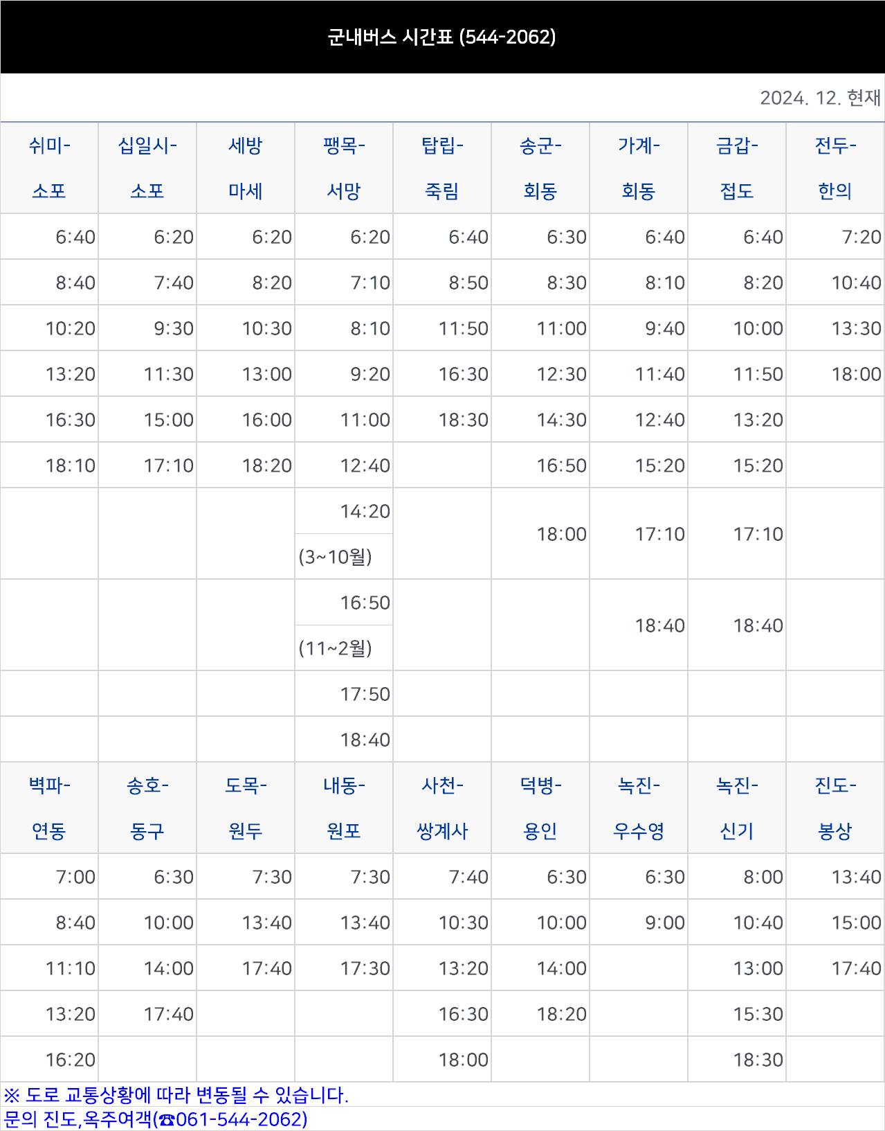 녹진 시외버스 터미널 시간표/요금표 2025년 06월 02일 기준