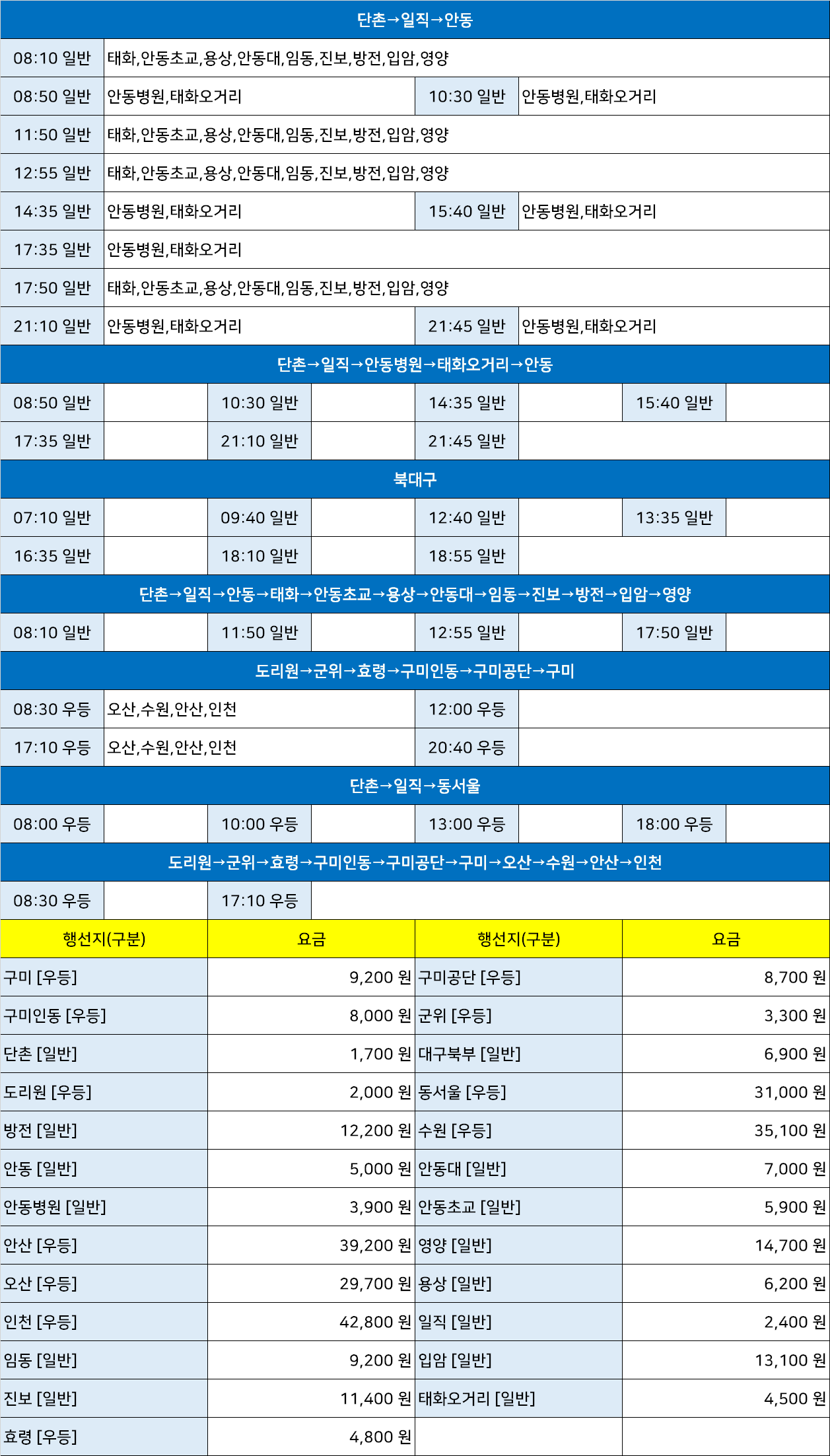 의성시외버스터미널 의성버스터미널 의성터미널 → "단촌→일직→동서울,단촌→일직→안동→태화→안동초교→용상→안동대→임동→진보→방전→입암→영양,단촌→일직→안동병원→태화오거리→안동,도리원→군위→효령→구미인동→구미공단→구미→오산→수원→안산→인천,북대구".