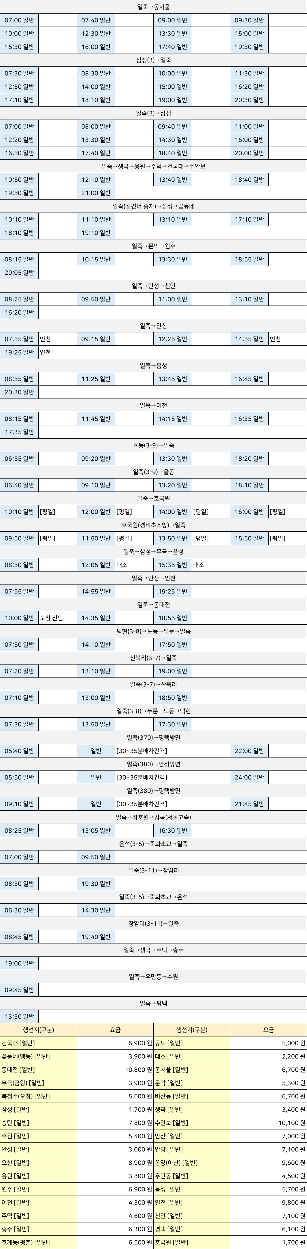 일죽 시외버스 터미널 시간표/요금표 2025년 04월 10일 기준