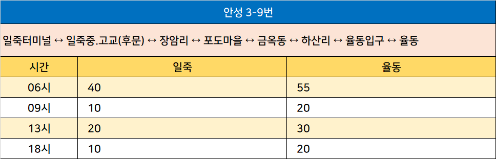 안성 3-9번: 일죽터미널 ↔ 일죽중.고교(후문) ↔ 장암리 ↔ 포도마을 ↔ 금옥동 ↔ 하산리 ↔ 율동입구 ↔ 율동