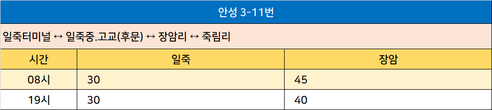 안성 3-11번: 일죽터미널 ↔ 일죽중.고교(후문) ↔ 장암리 ↔ 죽림리