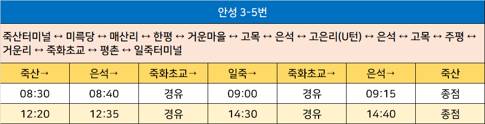 안성 3-5번: 죽산터미널 ↔ 미륵당 ↔ 매산리 ↔ 한평 ↔ 거운마을 ↔ 고목 ↔ 은석 ↔ 고은리(U턴) ↔ 은석 ↔ 고목 ↔ 주평 ↔ 거운리 ↔ 죽화초교 ↔ 평촌 ↔ 일죽터미널