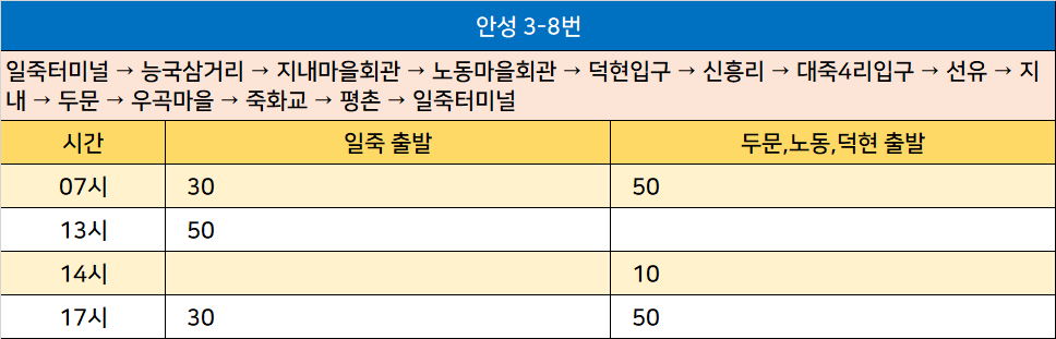 안성 3-8번: 일죽터미널 → 능국삼거리 → 지내마을회관 → 노동마을회관 → 덕현입구 → 신흥리 → 대죽4리입구 → 선유 → 지내 → 두문 → 우곡마을 → 죽화교 → 평촌 → 일죽터미널