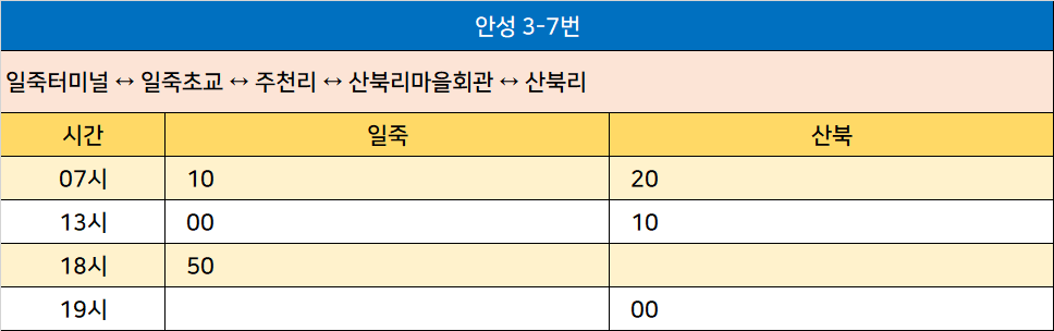 안성 3-7번: 일죽터미널 ↔ 일죽초교 ↔ 주천리 ↔ 산북리마을회관 ↔ 산북리