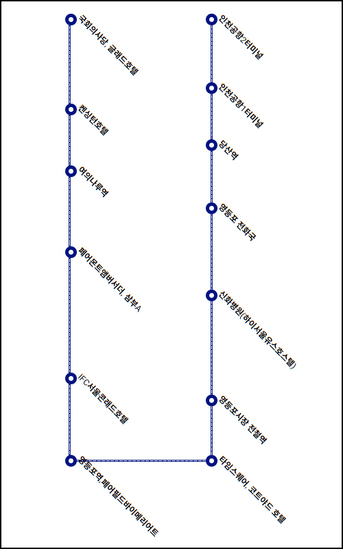 인천공항2터미널 → 인천공항1터미널 → 당산역 → 영등포전화국 → 신화병원(하이서울유스호스텔) → 영등포시장역 → 타임스퀘어,코트야드호텔 → 영등포역(페어필드바이메리어트) → IFC서울콘래드호텔 → 페어몬트앰버서더, 삼부A → 여의나루역 → 켄싱턴호텔 → 국회의사당,글래드호텔