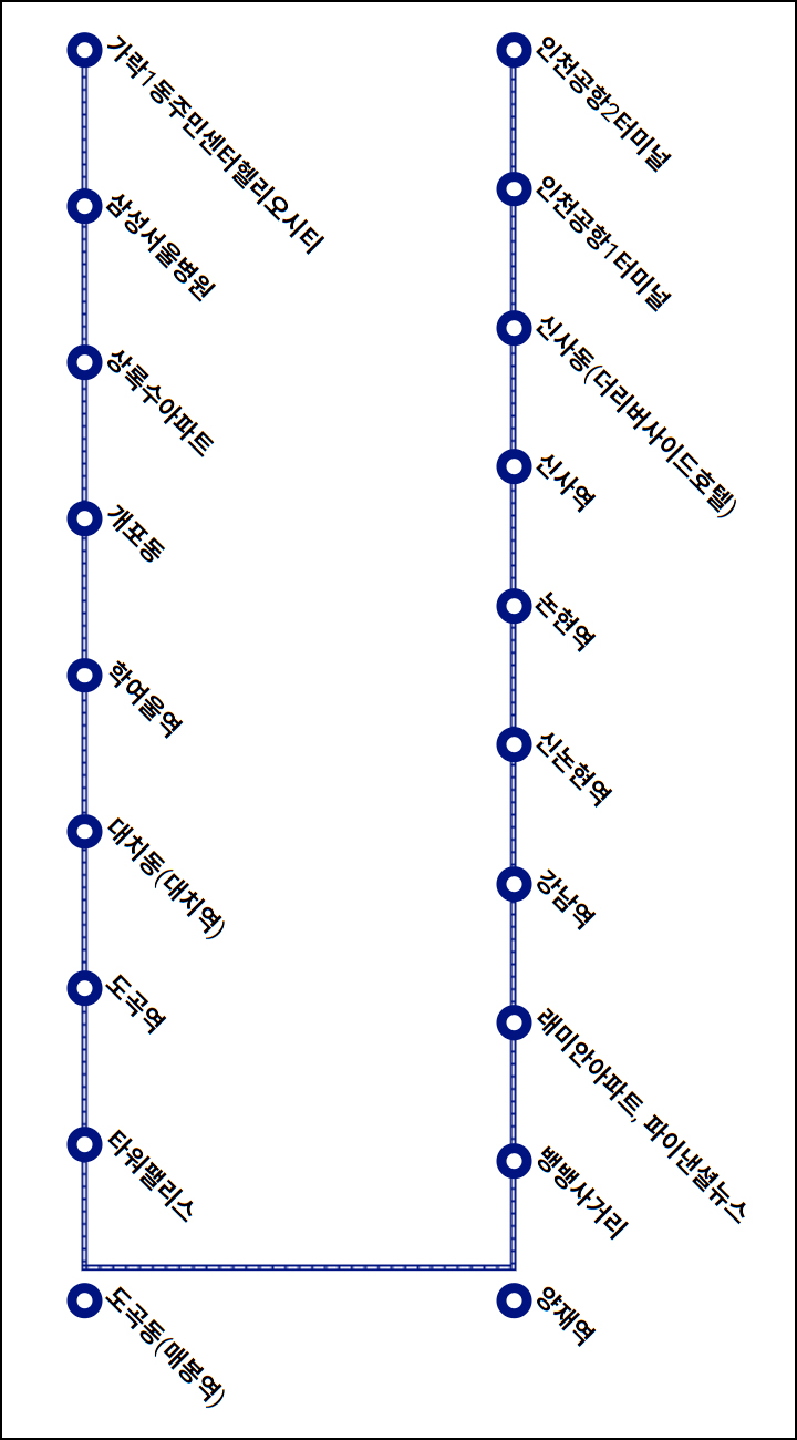 인천공항2터미널 → 인천공항1터미널 → 신사동(더리버사이드호텔) → 신사역 → 논현역 → 신논현역 → 강남역 → 래미안아파트, 파이낸셜뉴스 → 뱅뱅사거리 → 양재역 → 도곡동(매봉역) → 타워팰리스 → 도곡역 → 대치동(대치역) → 학여울역 → 개포동 → 상록수아파트 → 삼성서울병원 → 가락1동주민센터헬리오시티