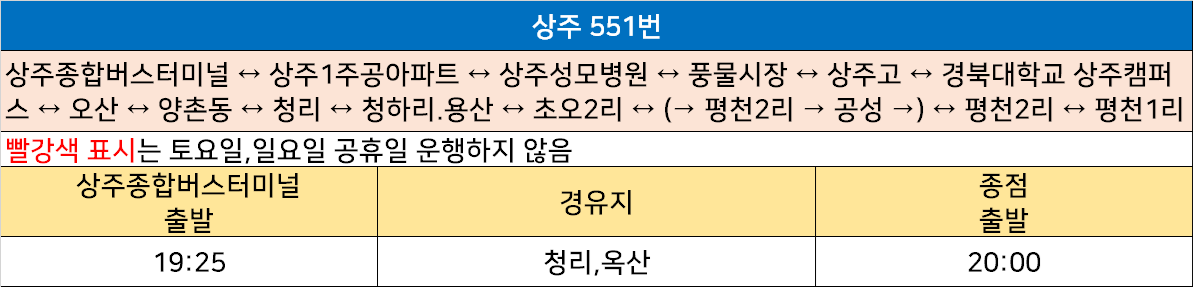 상주 551번: 상주종합버스터미널 ↔ 상주1주공아파트 ↔ 상주성모병원 ↔ 풍물시장 ↔ 상주고 ↔ 경북대학교 상주캠퍼스 ↔ 오산 ↔ 양촌동 ↔ 청리 ↔ 청하리.용산 ↔ 초오2리 ↔ (→ 평천2리 → 공성 →) ↔ 평천2리 ↔ 평천1리