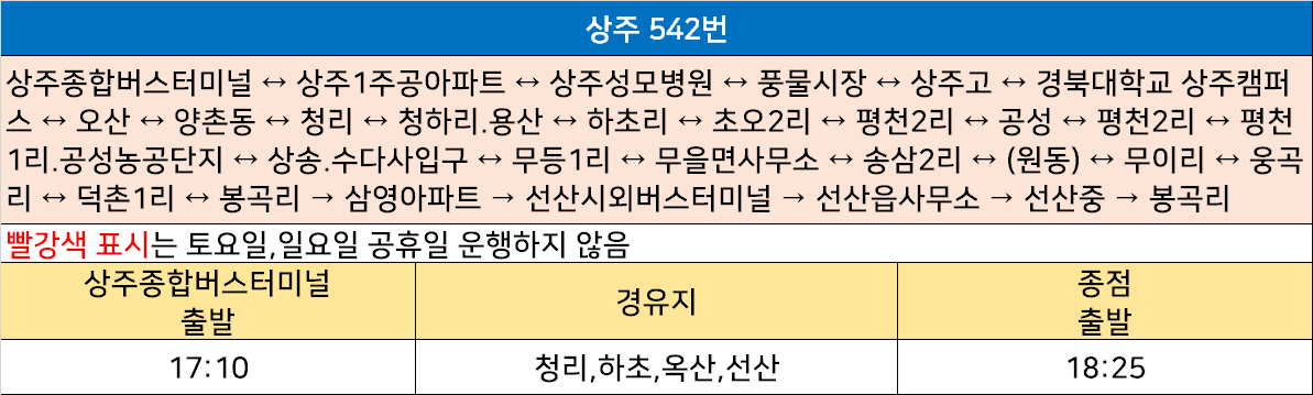 상주 542번: 상주종합버스터미널 ↔ 상주1주공아파트 ↔ 상주성모병원 ↔ 풍물시장 ↔ 상주고 ↔ 경북대학교 상주캠퍼스 ↔ 오산 ↔ 양촌동 ↔ 청리 ↔ 청하리.용산 ↔ 하초리 ↔ 초오2리 ↔ 평천2리 ↔ 공성 ↔ 평천2리 ↔ 평천1리.공성농공단지 ↔ 상송.수다사입구 ↔ 무등1리 ↔ 무을면사무소 ↔ 송삼2리 ↔ (원동) ↔ 무이리 ↔ 웅곡리 ↔ 덕촌1리 ↔ 봉곡리 → 삼영아파트 → 선산시외버스터미널 → 선산읍사무소 → 선산중 → 봉곡리