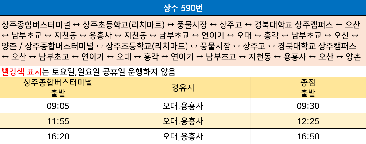 상주 590번: 상주종합버스터미널 ↔ 상주초등학교(리치마트) ↔ 풍물시장 ↔ 상주고 ↔ 경북대학교 상주캠퍼스 ↔ 오산 ↔ 남부초교 ↔ 지천동 ↔ 용흥사 ↔ 지천동 ↔ 남부초교 ↔ 연이기 ↔ 오대 ↔ 흥각 ↔ 남부초교 ↔ 오산 ↔ 양촌 / 상주종합버스터미널 ↔ 상주초등학교(리치마트) ↔ 풍물시장 ↔ 상주고 ↔ 경북대학교 상주캠퍼스 ↔ 오산 ↔ 남부초교 ↔ 연이기 ↔ 오대 ↔ 흥각 ↔ 연이기 ↔ 남부초교 ↔ 지천동 ↔ 용흥사 ↔ 오산 ↔ 양촌