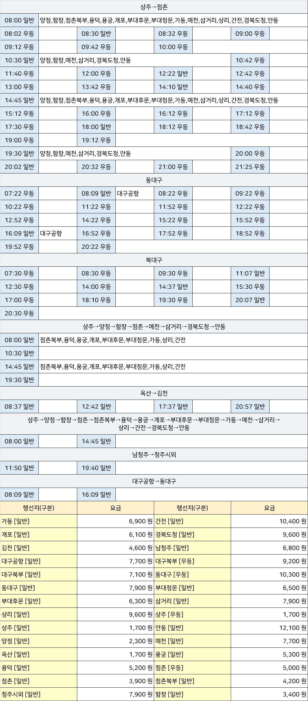 경북대 상주 캠퍼스 시외버스 터미널 시간표/요금표 2025년 09월 16일 기준