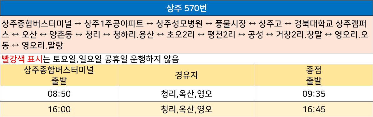 상주 570번: 상주종합버스터미널 ↔ 상주1주공아파트 ↔ 상주성모병원 ↔ 풍물시장 ↔ 상주고 ↔ 경북대학교 상주캠퍼스 ↔ 오산 ↔ 양촌동 ↔ 청리 ↔ 청하리.용산 ↔ 초오2리 ↔ 평천2리 ↔ 공성 ↔ 거창2리.창말 ↔ 영오리.오동 ↔ 영오리.말랑