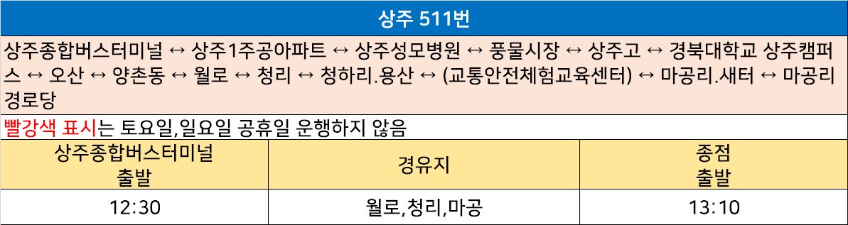 상주 511번: 상주종합버스터미널 ↔ 상주1주공아파트 ↔ 상주성모병원 ↔ 풍물시장 ↔ 상주고 ↔ 경북대학교 상주캠퍼스 ↔ 오산 ↔ 양촌동 ↔ 월로 ↔ 청리 ↔ 청하리.용산 ↔ (교통안전체험교육센터) ↔ 마공리.새터 ↔ 마공리경로당