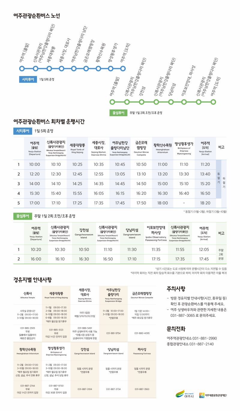 여주관광순환버스 노선정보:여주역 [출발] - 신륵사 관광지(여주 남한강 출렁다리 북단) - 세종대왕릉 - 세종시장/대로사 - 남한강 출렁다리 남단 - 금은모래캠핑장 - 황학산수목원 - 명성황후생가 - 여주역 [도착]