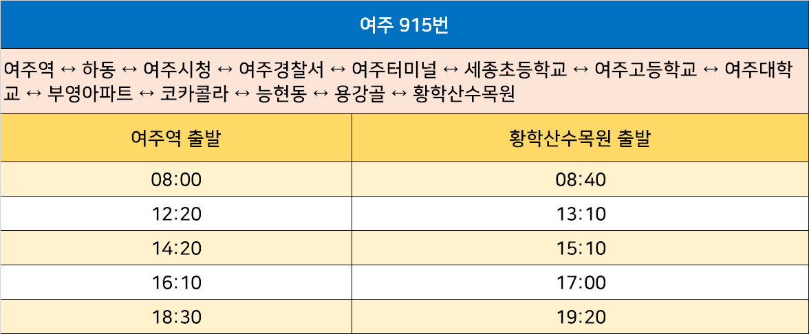 여주 915번: 여주역 ↔ 하동 ↔ 여주시청 ↔ 여주경찰서 ↔ 여주터미널 ↔ 세종초등학교 ↔ 여주고등학교 ↔ 여주대학교 ↔ 부영아파트 ↔ 코카콜라 ↔ 능현동 ↔ 용강골 ↔ 황학산수목원