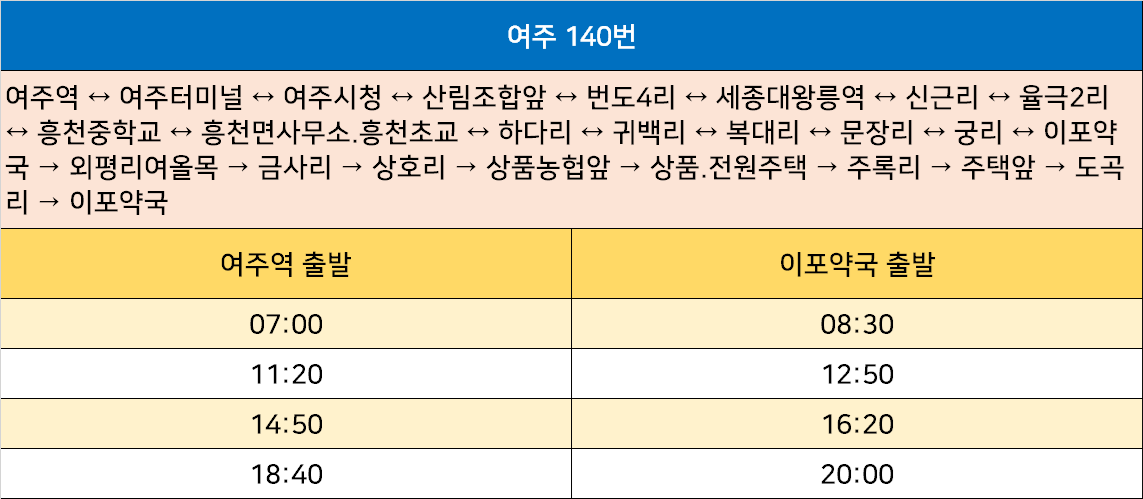 여주 140번: 여주역 ↔ 여주터미널 ↔ 여주시청 ↔ 산림조합앞 ↔ 번도4리 ↔ 세종대왕릉역 ↔ 신근리 ↔ 율극2리 ↔ 흥천중학교 ↔ 흥천면사무소.흥천초교 ↔ 하다리 ↔ 귀백리 ↔ 복대리 ↔ 문장리 ↔ 궁리 ↔ 이포약국 → 외평리여올목 → 금사리 → 상호리 → 상품농헙앞 → 상품.전원주택 → 주록리 → 주택앞 → 도곡리 → 이포약국