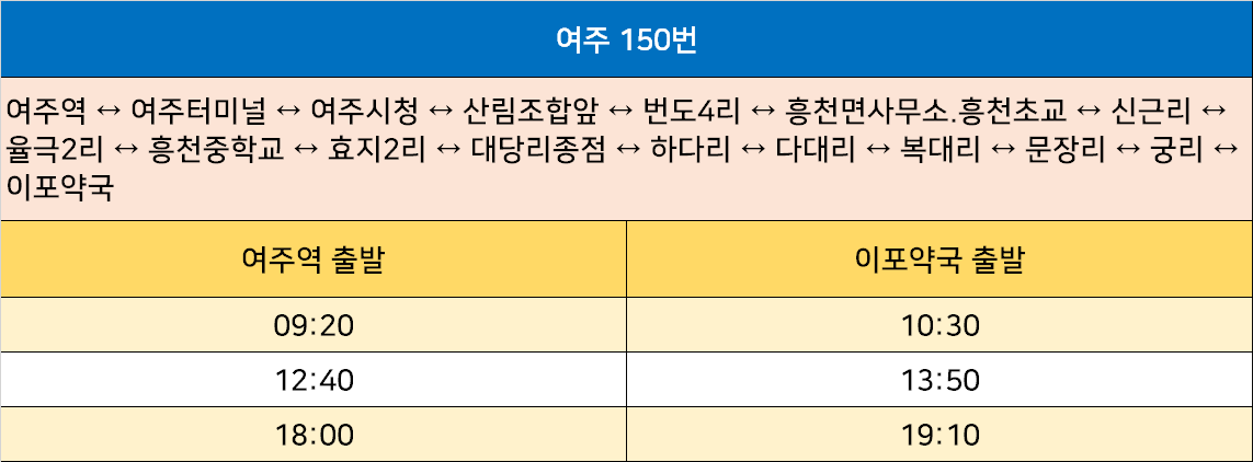 여주 150번: 여주역 ↔ 여주터미널 ↔ 여주시청 ↔ 산림조합앞 ↔ 번도4리 ↔ 흥천면사무소.흥천초교 ↔ 신근리 ↔ 율극2리 ↔ 흥천중학교 ↔ 효지2리 ↔ 대당리종점 ↔ 하다리 ↔ 다대리 ↔ 복대리 ↔ 문장리 ↔ 궁리 ↔ 이포약국