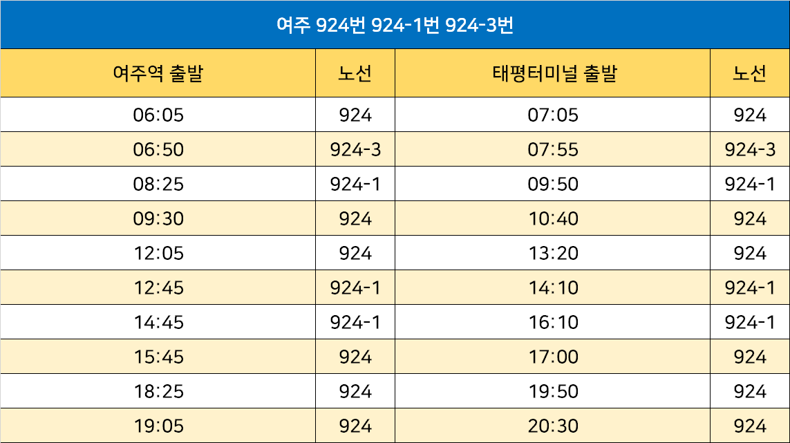 여주 924-1번: 여주역 ↔ 세종여주병원 ↔ 하동 ↔ (→ KT여주지점 →/← 여주시청 ←) ↔ 여주터미널 ↔ 세종초등학교 ↔ 여주대학교 ↔ 점봉초등학교 ↔ 삼교동 ↔ 점동중고 ↔ 청안2리 ↔ 금곡리 ↔ 금당2리 ↔ 남한강공원묘원 ↔ 송림리 ↔ 삼승리 ↔ 연대리 ↔ 양귀리 ↔ 맹골 ↔ 삼군1리 ↔ 여주제일중고 ↔ 태평리 ↔ 태평터미널