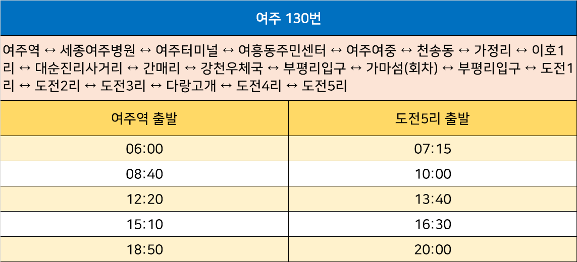 여주 130번: 여주역 ↔ 세종여주병원 ↔ 여주터미널 ↔ 여흥동주민센터 ↔ 여주여중 ↔ 천송동 ↔ 가정리 ↔ 이호1리 ↔ 대순진리사거리 ↔ 간매리 ↔ 강천우체국 ↔ 부평리입구 ↔ 가마섬(회차) ↔ 부평리입구 ↔ 도전1리 ↔ 도전2리 ↔ 도전3리 ↔ 다랑고개 ↔ 도전4리 ↔ 도전5리