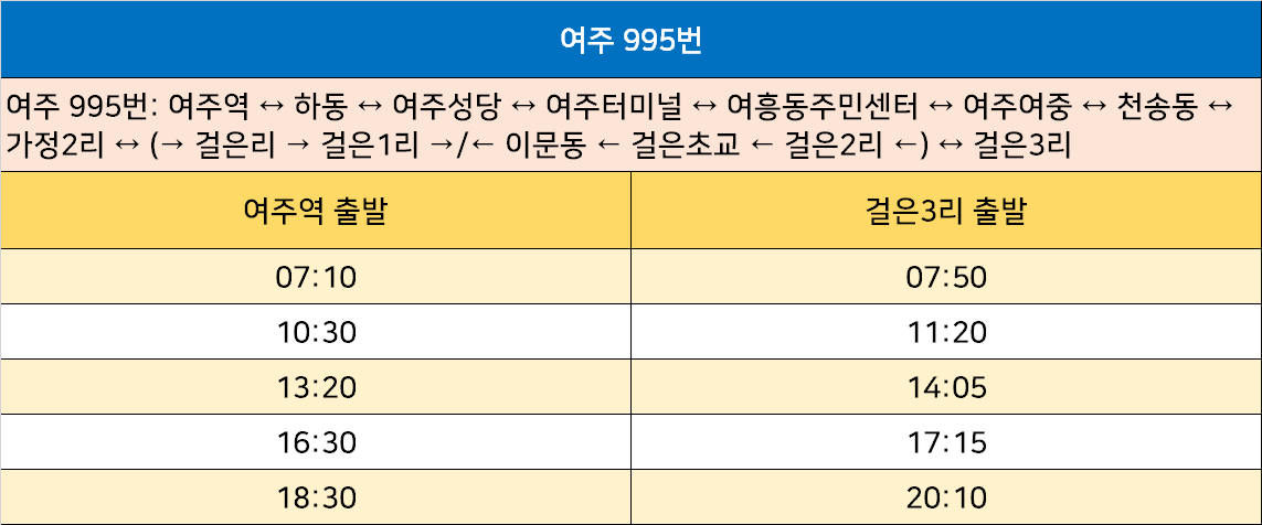 여주 995번: 여주역 ↔ 하동 ↔ 여주성당 ↔ 여주터미널 ↔ 여흥동주민센터 ↔ 여주여중 ↔ 천송동 ↔ 가정2리 ↔ (→ 걸은리 → 걸은1리 →/← 이문동 ← 걸은초교 ← 걸은2리 ←) ↔ 걸은3리