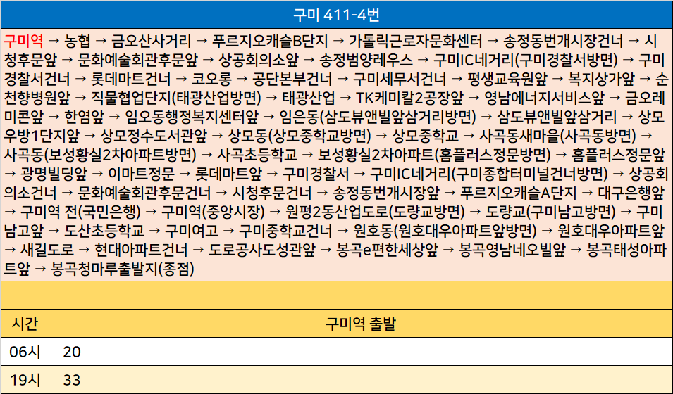 구미 411-4번: 구미역 → 농협 → 금오산사거리 → 푸르지오캐슬B단지 → 가톨릭근로자문화센터 → 송정동번개시장건너 → 시청후문앞 → 문화예술회관후문앞 → 상공회의소앞 → 송정범양레우스 → 구미IC네거리 → 구미경찰서건너 → 롯데마트건너 → 코오롱 → 공단본부건너 → 구미세무서건너 → 평생교육원앞 → 복지상가앞 → 순천향병원앞 → 직물협업단지 → 태광산업 → TK케미칼2공장앞 → 영남에너지서비스앞 → 금오레미콘앞 → 한염앞 → 임오동행정복지센터앞 → 임은동 → 삼도뷰앤빌앞삼거리 → 상모우방1단지앞 → 상모정수도서관앞 → 상모동 → 상모중학교 → 사곡동새마을 → 사곡동 → 사곡초등학교 → 보성황실2차아파트 → 홈플러스정문앞 → 광명빌딩앞 → 이마트정문 → 롯데마트앞 → 구미경찰서 → 구미IC네거리 → 상공회의소건너 → 문화예술회관후문건너 → 시청후문건너 → 송정동번개시장앞 → 푸르지오캐슬A단지 → 대구은행앞 → 구미역 전 → 구미역 → 원평2동산업도로 → 도량교 → 구미남고앞 → 도산초등학교 → 구미여고 → 구미중학교건너 → 원호동 → 원호대우아파트앞 → 새길도로 → 현대아파트건너 → 도로공사도성관앞 → 봉곡e편한세상앞 → 봉곡영남네오빌앞 → 봉곡태성아파트앞 → 봉곡청마루출발지