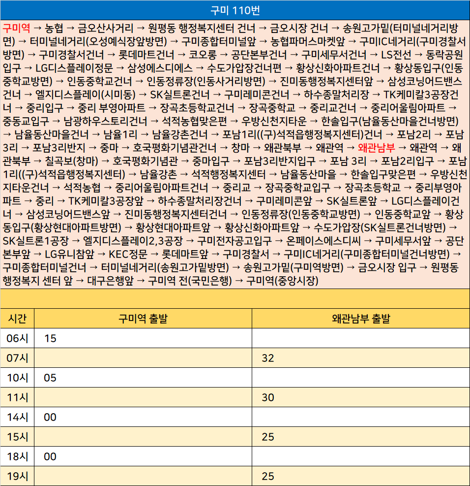 구미 110번: 구미역 → 농협 → 금오산사거리 → 원평동 행정복지센터 건너 → 금오시장 건너 → 송원고가밑 → 터미널네거리 → 구미종합터미널앞 → 농협파머스마켓앞 → 구미IC네거리 → 구미경찰서건너 → 롯데마트건너 → 코오롱 → 공단본부건너 → 구미세무서건너 → LS전선 → 동락공원입구 → LG디스플레이정문 → 삼성에스디에스 → 수도가압장건너편 → 황상신화아파트건너 → 황상동입구 → 인동중학교건너 → 인동정류장 → 진미동행정복지센터앞 → 삼성코닝어드밴스건너 → 엘지디스플레이 → SK실트론건너 → 구미레미콘건너 → 하수종말처리장 → TK케미칼3공장건너 → 중리입구 → 중리 부영아파트 → 장곡초등학교건너 → 장곡중학교 → 중리교건너 → 중리어울림아파트 → 중동교입구 → 남광하우스토리건너 → 석적농협맞은편 → 우방신천지타운 → 한솔입구 → 남율동산마을건너 → 남율1리 → 남율강촌건너 → 포남1리석적읍행정복지센터)건너 → 포남2리 → 포남3리 → 포남3리반지 → 중마 → 호국평화기념관건너 → 창마 → 왜관북부 → 왜관역 → 왜관남부 → 왜관역 → 왜관북부 → 칠곡보 → 호국평화기념관 → 중마입구 → 포남3리반지입구 → 포남 3리 → 포남2리입구 → 포남1리석적읍행정복지센터) → 남율강촌 → 석적행정복지센터 → 남율동산마을 → 한솔입구맞은편 → 우방신천지타운건너 → 석적농협 → 중리어울림아파트건너 → 중리교 → 장곡중학교입구 → 장곡초등학교 → 중리부영아파트 → 중리 → TK케미칼3공장앞 → 하수종말처리장건너 → 구미레미콘앞 → SK실트론앞 → LG디스플레이건너 → 삼성코닝어드밴스앞 → 진미동행정복지센터건너 → 인동정류장 → 인동중학교앞 → 황상동입구 → 황상현대아파트앞 → 황상신화아파트앞 → 수도가압장 → SK실트론1공장 → 엘지디스플레이2,3공장 → 구미전자공고입구 → 온페이스에스디씨 → 구미세무서앞 → 공단본부앞 → LG유니참앞 → KEC정문 → 롯데마트앞 → 구미경찰서 → 구미IC네거리 → 구미종합터미널건너 → 터미널네거리 → 송원고가밑 → 금오시장 입구 → 원평동 행정복지 센터 앞 → 대구은행앞 → 구미역 전 → 구미역