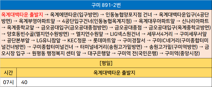 구미 891-2번: 옥계대백타운 출발지 → 옥계에덴타운 → 인동농협양포지점 건너 → 옥계대백타운입구 → 옥계부영아파트앞 → 4공단입구건너 → 옥계대우아파트앞 → 신나리아파트 → 옥계중학교앞 → 금오공대입구 → 금오공대종점 → 금오공대입구 → 양호동빈수골 → 엘지연수원앞 → LIG넥스원건너 → 세무서4거리 → 구미세무서앞 → 공단본부앞 → LG유니참앞 → KEC정문 → 롯데마트앞 → 구미경찰서 → 구미IC네거리 → 구미종합터미널건너 → 터미널네거리 → 송원고가밑 → 금오시장 입구 → 원평동 행정복지 센터 앞 → 대구은행앞 → 구미역 전 → 구미역