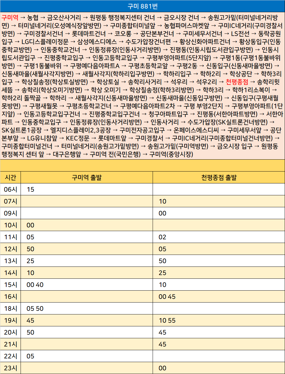 구미 881번: 구미역 → 농협 → 금오산사거리 → 원평동 행정복지센터 건너 → 금오시장 건너 → 송원고가밑 → 터미널네거리 → 구미종합터미널앞 → 농협파머스마켓앞 → 구미IC네거리 → 구미경찰서건너 → 롯데마트건너 → 코오롱 → 공단본부건너 → 구미세무서건너 → LS전선 → 동락공원입구 → LG디스플레이정문 → 삼성에스디에스 → 수도가압장건너편 → 황상신화아파트건너 → 황상동입구 → 인동중학교건너 → 인동정류장 → 진평동 → 인동시립도서관입구 → 진평중학교입구 → 인동고등학교입구 → 구평부영아파트 → 구평1동 → 구평1동불바위 → 구평예다음아파트A → 구평초등학교앞 → 구평2동 → 신동입구 → 신동새마을 → 새월사각지 → 학하리입구 → 학하2리 → 학상공단 → 학하3리입구 → 학상칠송정 → 학상토실 → 송학리사거리 → 석우리 → 석우2리 → 천평종점 → 송학리윗세뜸 → 송학리 → 학상 오미기 → 학상칠송정 → 학하3리 → 학하1리소복이 → 학하2리 돌짝골 → 학하리 → 새월사각지 → 신동새마을 → 신동입구 → 구평새월못 → 구평초등학교건너 → 구평예다음아파트2차 → 구평 부영2단지 → 구평부영아파트 → 인동고등학교입구건너 → 진평중학교입구건너 → 청구아파트입구 → 진평동 → 서한아파트 → 인동중학교입구 → 인동정류장 → 인동사거리 → 수도가압장 → SK실트론1공장 → 엘지디스플레이2,3공장 → 구미전자공고입구 → 온페이스에스디씨 → 구미세무서앞 → 공단본부앞 → LG유니참앞 → KEC정문 → 롯데마트앞 → 구미경찰서 → 구미IC네거리 → 구미종합터미널건너 → 터미널네거리 → 송원고가밑 → 금오시장 입구 → 원평동 행정복지 센터 앞 → 대구은행앞 → 구미역 전 → 구미역