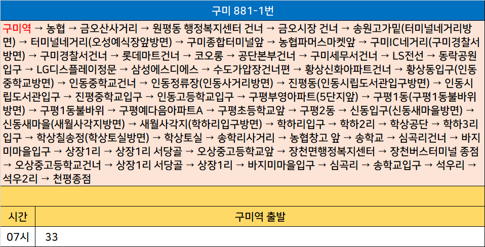 구미 881-1번: 구미역 → 농협 → 금오산사거리 → 원평동 행정복지센터 건너 → 금오시장 건너 → 송원고가밑 → 터미널네거리 → 구미종합터미널앞 → 농협파머스마켓앞 → 구미IC네거리 → 구미경찰서건너 → 롯데마트건너 → 코오롱 → 공단본부건너 → 구미세무서건너 → LS전선 → 동락공원입구 → LG디스플레이정문 → 삼성에스디에스 → 수도가압장건너편 → 황상신화아파트건너 → 황상동입구 → 인동중학교건너 → 인동정류장 → 진평동 → 인동시립도서관입구 → 진평중학교입구 → 인동고등학교입구 → 구평부영아파트 → 구평1동 → 구평1동불바위 → 구평예다음아파트A → 구평초등학교앞 → 구평2동 → 신동입구 → 신동새마을 → 새월사각지 → 학하리입구 → 학하2리 → 학상공단 → 학하3리입구 → 학상칠송정 → 학상토실 → 송학리사거리 → 농협창고 앞 → 송학교 → 심곡리건너 → 바지미마을입구 → 상장1리 → 상장1리 서당골 → 오상중고등학교앞 → 장천면행정복지센터 → 장천버스터미널 종점 → 오상중고등학교건너 → 상장1리 서당골 → 상장1리 → 바지미마을입구 → 심곡리 → 송학교입구 → 석우리 → 석우2리 → 천평종점