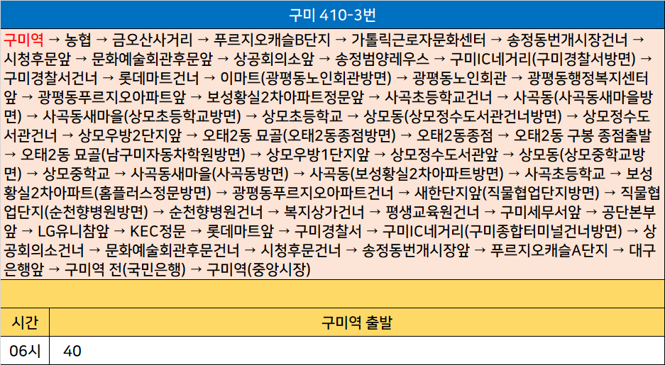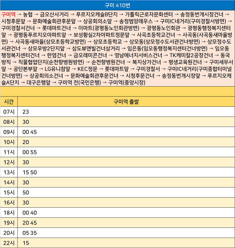 구미 410번: 구미역 → 농협 → 금오산사거리 → 푸르지오캐슬B단지 → 가톨릭근로자문화센터 → 송정동번개시장건너 → 시청후문앞 → 문화예술회관후문앞 → 상공회의소앞 → 송정범양레우스 → 구미IC네거리 → 구미경찰서건너 → 롯데마트건너 → 이마트 → 광평동노인회관 → 광평동행정복지센터앞 → 광평동푸르지오아파트앞 → 보성황실2차아파트정문앞 → 사곡초등학교건너 → 사곡동 → 사곡동새마을 → 상모초등학교 → 상모동 → 상모정수도서관건너 → 상모우방2단지앞 → 삼도뷰앤빌건너삼거리 → 임은동 → 임오동행정복지센터건너 → 한염건너 → 금오레미콘건너 → 영남에너지서비스건너 → TK케미칼2공장건너 → 동국방직 → 직물협업단지 → 순천향병원건너 → 복지상가건너 → 평생교육원건너 → 구미세무서앞 → 공단본부앞 → LG유니참앞 → KEC정문 → 롯데마트앞 → 구미경찰서 → 구미IC네거리 → 상공회의소건너 → 문화예술회관후문건너 → 시청후문건너 → 송정동번개시장앞 → 푸르지오캐슬A단지 → 대구은행앞 → 구미역 전 → 구미역