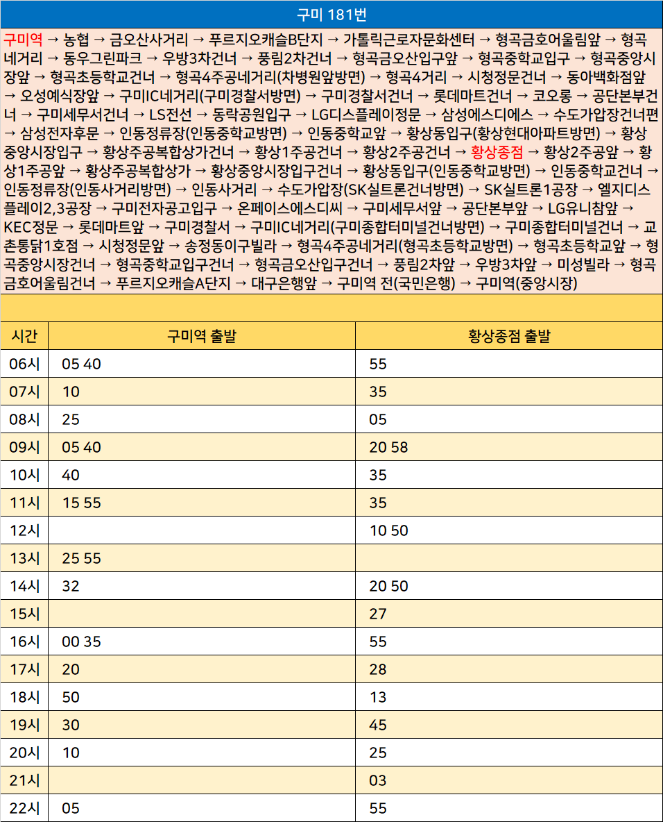 구미 181번: 구미역 → 농협 → 금오산사거리 → 푸르지오캐슬B단지 → 가톨릭근로자문화센터 → 형곡금호어울림앞 → 형곡네거리 → 동우그린파크 → 우방3차건너 → 풍림2차건너 → 형곡금오산입구앞 → 형곡중학교입구 → 형곡중앙시장앞 → 형곡초등학교건너 → 형곡4주공네거리 → 형곡4거리 → 시청정문건너 → 동아백화점앞 → 오성예식장앞 → 구미IC네거리 → 구미경찰서건너 → 롯데마트건너 → 코오롱 → 공단본부건너 → 구미세무서건너 → LS전선 → 동락공원입구 → LG디스플레이정문 → 삼성에스디에스 → 수도가압장건너편 → 삼성전자후문 → 인동정류장 → 인동중학교앞 → 황상동입구 → 황상중앙시장입구 → 황상주공복합상가건너 → 황상1주공건너 → 황상2주공건너 → 황상종점 → 황상2주공앞 → 황상1주공앞 → 황상주공복합상가 → 황상중앙시장입구건너 → 황상동입구 → 인동중학교건너 → 인동정류장 → 인동사거리 → 수도가압장 → SK실트론1공장 → 엘지디스플레이2,3공장 → 구미전자공고입구 → 온페이스에스디씨 → 구미세무서앞 → 공단본부앞 → LG유니참앞 → KEC정문 → 롯데마트앞 → 구미경찰서 → 구미IC네거리 → 구미종합터미널건너 → 교촌통닭1호점 → 시청정문앞 → 송정동이구빌라 → 형곡4주공네거리 → 형곡초등학교앞 → 형곡중앙시장건너 → 형곡중학교입구건너 → 형곡금오산입구건너 → 풍림2차앞 → 우방3차앞 → 미성빌라 → 형곡금호어울림건너 → 푸르지오캐슬A단지 → 대구은행앞 → 구미역 전 → 구미역