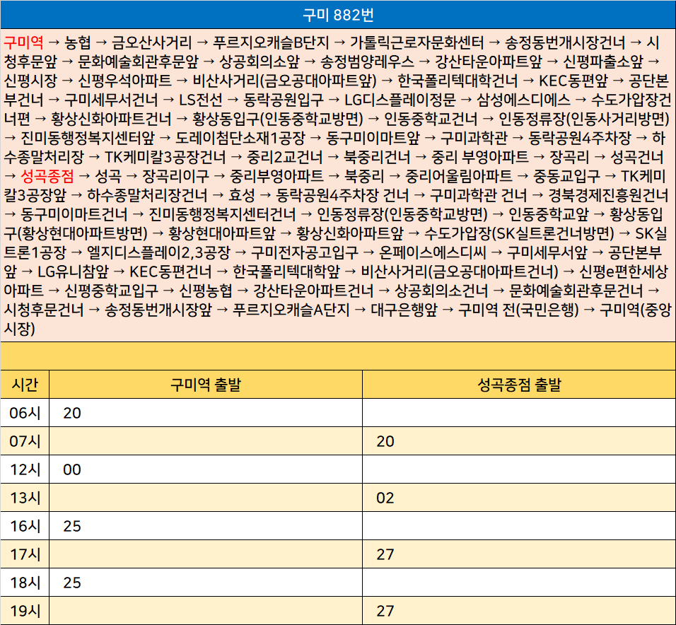 구미 882번: 구미역 → 농협 → 금오산사거리 → 푸르지오캐슬B단지 → 가톨릭근로자문화센터 → 송정동번개시장건너 → 시청후문앞 → 문화예술회관후문앞 → 상공회의소앞 → 송정범양레우스 → 강산타운아파트앞 → 신평파출소앞 → 신평시장 → 신평우석아파트 → 비산사거리 → 한국폴리텍대학건너 → KEC동편앞 → 공단본부건너 → 구미세무서건너 → LS전선 → 동락공원입구 → LG디스플레이정문 → 삼성에스디에스 → 수도가압장건너편 → 황상신화아파트건너 → 황상동입구 → 인동중학교건너 → 인동정류장 → 진미동행정복지센터앞 → 도레이첨단소재1공장 → 동구미이마트앞 → 구미과학관 → 동락공원4주차장 → 하수종말처리장 → TK케미칼3공장건너 → 중리2교건너 → 북중리건너 → 중리 부영아파트 → 장곡리 → 성곡건너 → 성곡종점 → 성곡 → 장곡리이구 → 중리부영아파트 → 북중리 → 중리어울림아파트 → 중동교입구 → TK케미칼3공장앞 → 하수종말처리장건너 → 효성 → 동락공원4주차장 건너 → 구미과학관 건너 → 경북경제진흥원건너 → 동구미이마트건너 → 진미동행정복지센터건너 → 인동정류장 → 인동중학교앞 → 황상동입구 → 황상현대아파트앞 → 황상신화아파트앞 → 수도가압장 → SK실트론1공장 → 엘지디스플레이2,3공장 → 구미전자공고입구 → 온페이스에스디씨 → 구미세무서앞 → 공단본부앞 → LG유니참앞 → KEC동편건너 → 한국폴리텍대학앞 → 비산사거리 → 신평e편한세상아파트 → 신평중학교입구 → 신평농협 → 강산타운아파트건너 → 상공회의소건너 → 문화예술회관후문건너 → 시청후문건너 → 송정동번개시장앞 → 푸르지오캐슬A단지 → 대구은행앞 → 구미역 전 → 구미역
