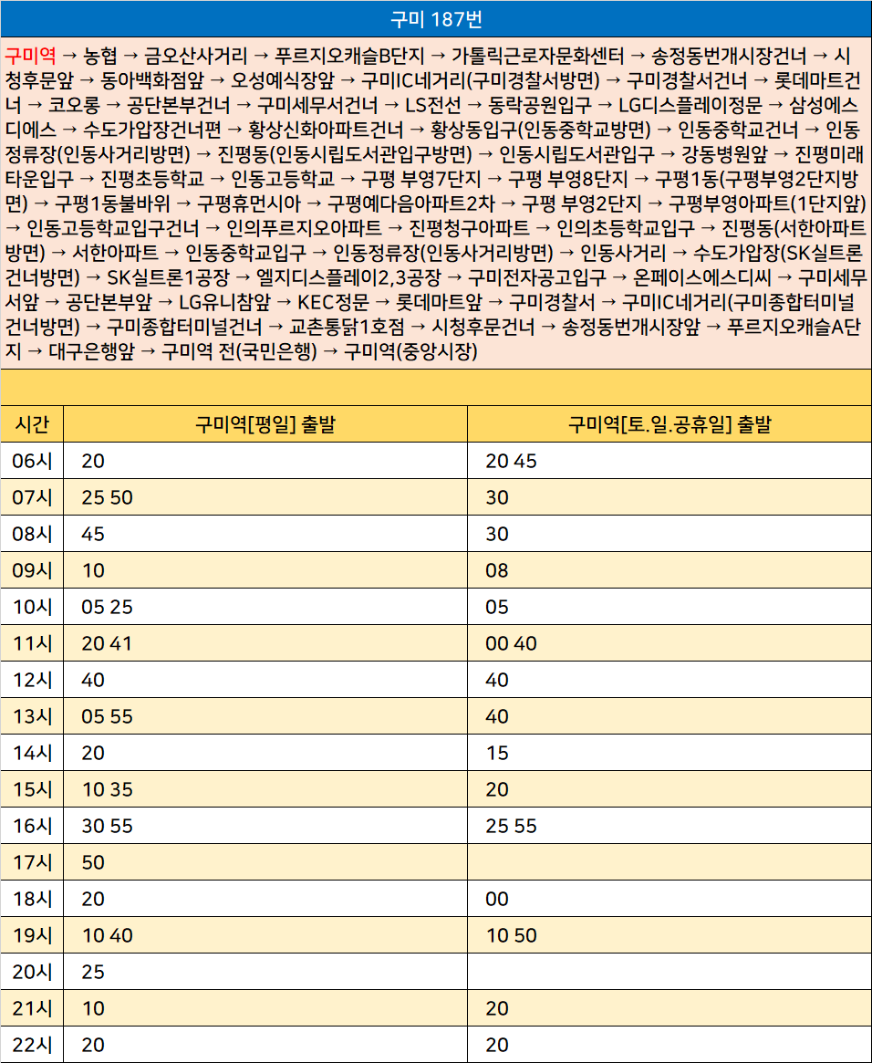 구미 187번: 구미역 → 농협 → 금오산사거리 → 푸르지오캐슬B단지 → 가톨릭근로자문화센터 → 송정동번개시장건너 → 시청후문앞 → 동아백화점앞 → 오성예식장앞 → 구미IC네거리 → 구미경찰서건너 → 롯데마트건너 → 코오롱 → 공단본부건너 → 구미세무서건너 → LS전선 → 동락공원입구 → LG디스플레이정문 → 삼성에스디에스 → 수도가압장건너편 → 황상신화아파트건너 → 황상동입구 → 인동중학교건너 → 인동정류장 → 진평동 → 인동시립도서관입구 → 강동병원앞 → 진평미래타운입구 → 진평초등학교 → 인동고등학교 → 구평 부영7단지 → 구평 부영8단지 → 구평1동 → 구평1동불바위 → 구평휴먼시아 → 구평예다음아파트2차 → 구평 부영2단지 → 구평부영아파트 → 인동고등학교입구건너 → 인의푸르지오아파트 → 진평청구아파트 → 인의초등학교입구 → 진평동 → 서한아파트 → 인동중학교입구 → 인동정류장 → 인동사거리 → 수도가압장 → SK실트론1공장 → 엘지디스플레이2,3공장 → 구미전자공고입구 → 온페이스에스디씨 → 구미세무서앞 → 공단본부앞 → LG유니참앞 → KEC정문 → 롯데마트앞 → 구미경찰서 → 구미IC네거리 → 구미종합터미널건너 → 교촌통닭1호점 → 시청후문건너 → 송정동번개시장앞 → 푸르지오캐슬A단지 → 대구은행앞 → 구미역 전 → 구미역