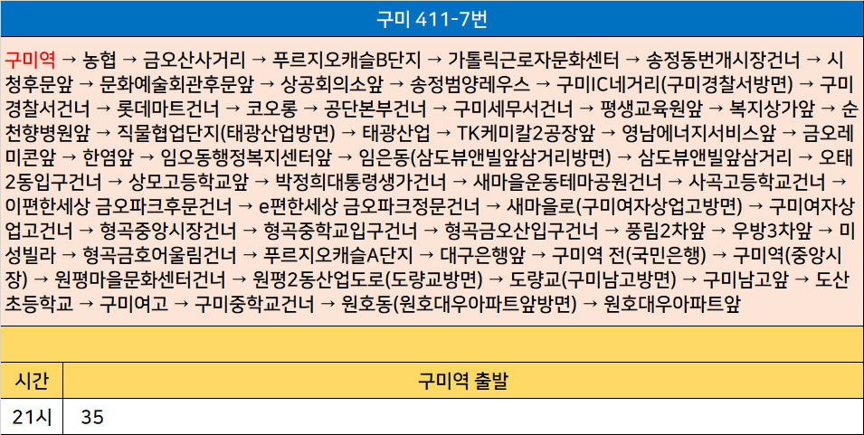 구미 411-7번: 구미역 → 농협 → 금오산사거리 → 푸르지오캐슬B단지 → 가톨릭근로자문화센터 → 송정동번개시장건너 → 시청후문앞 → 문화예술회관후문앞 → 상공회의소앞 → 송정범양레우스 → 구미IC네거리 → 구미경찰서건너 → 롯데마트건너 → 코오롱 → 공단본부건너 → 구미세무서건너 → 평생교육원앞 → 복지상가앞 → 순천향병원앞 → 직물협업단지 → 태광산업 → TK케미칼2공장앞 → 영남에너지서비스앞 → 금오레미콘앞 → 한염앞 → 임오동행정복지센터앞 → 임은동 → 삼도뷰앤빌앞삼거리 → 오태2동입구건너 → 상모고등학교앞 → 박정희대통령생가건너 → 새마을운동테마공원건너 → 사곡고등학교건너 → 이편한세상 금오파크후문건너 → e편한세상 금오파크정문건너 → 새마을로 → 구미여자상업고건너 → 형곡중앙시장건너 → 형곡중학교입구건너 → 형곡금오산입구건너 → 풍림2차앞 → 우방3차앞 → 미성빌라 → 형곡금호어울림건너 → 푸르지오캐슬A단지 → 대구은행앞 → 구미역 전 → 구미역 → 원평마을문화센터건너 → 원평2동산업도로 → 도량교 → 구미남고앞 → 도산초등학교 → 구미여고 → 구미중학교건너 → 원호동 → 원호대우아파트앞