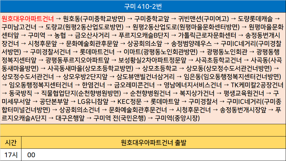 구미 410-2번: 원호대우아파트건너 → 원호동 → 구미중학교앞 → 귀빈맨션 → 도량롯데캐슬 → 구미남고건너 → 도량교 → 원평2동산업도로 → 원평마을문화센터앞 → 구미역 → 농협 → 금오산사거리 → 푸르지오캐슬B단지 → 가톨릭근로자문화센터 → 송정동번개시장건너 → 시청후문앞 → 문화예술회관후문앞 → 상공회의소앞 → 송정범양레우스 → 구미IC네거리 → 구미경찰서건너 → 롯데마트건너 → 이마트 → 광평동노인회관 → 광평동행정복지센터앞 → 광평동푸르지오아파트앞 → 보성황실2차아파트정문앞 → 사곡초등학교건너 → 사곡동 → 사곡동새마을 → 상모초등학교 → 상모동 → 상모정수도서관건너 → 상모우방2단지앞 → 삼도뷰앤빌건너삼거리 → 임은동 → 임오동행정복지센터건너 → 한염건너 → 금오레미콘건너 → 영남에너지서비스건너 → TK케미칼2공장건너 → 동국방직 → 직물협업단지 → 순천향병원건너 → 복지상가건너 → 평생교육원건너 → 구미세무서앞 → 공단본부앞 → LG유니참앞 → KEC정문 → 롯데마트앞 → 구미경찰서 → 구미IC네거리 → 상공회의소건너 → 문화예술회관후문건너 → 시청후문건너 → 송정동번개시장앞 → 푸르지오캐슬A단지 → 대구은행앞 → 구미역 전 → 구미역