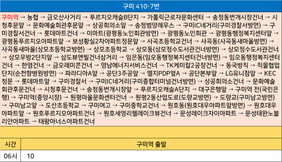 구미 410-7번: 구미역 → 농협 → 금오산사거리 → 푸르지오캐슬B단지 → 가톨릭근로자문화센터 → 송정동번개시장건너 → 시청후문앞 → 문화예술회관후문앞 → 상공회의소앞 → 송정범양레우스 → 구미IC네거리 → 구미경찰서건너 → 롯데마트건너 → 이마트 → 광평동노인회관 → 광평동행정복지센터앞 → 광평동푸르지오아파트앞 → 보성황실2차아파트정문앞 → 사곡초등학교건너 → 사곡동 → 사곡동새마을 → 상모초등학교 → 상모동 → 상모정수도서관건너 → 상모우방2단지앞 → 삼도뷰앤빌건너삼거리 → 임은동 → 임오동행정복지센터건너 → 한염건너 → 금오레미콘건너 → 영남에너지서비스건너 → TK케미칼2공장건너 → 동국방직 → 직물협업단지 → 파라디아A앞 → 공단3주공앞 → 엘지PDP옆A → 공단본부앞 → LG유니참앞 → KEC정문 → 롯데마트앞 → 구미경찰서 → 구미IC네거리 → 상공회의소건너 → 문화예술회관후문건너 → 시청후문건너 → 송정동번개시장앞 → 푸르지오캐슬A단지 → 대구은행앞 → 구미역 전 → 구미역 → 원평마을문화센터건너 → 원평2동산업도로 → 도량교 → 구미남고앞 → 도산초등학교 → 구미여고 → 구미중학교건너 → 원호동 → 원호대우아파트앞 → 원호푸르지오아파트건너 → 원호세영리첼레이크뷰건너 → 문성레이크자이아파트 → 문성태완노블리안아파트 → 태왕아너스아파트건너