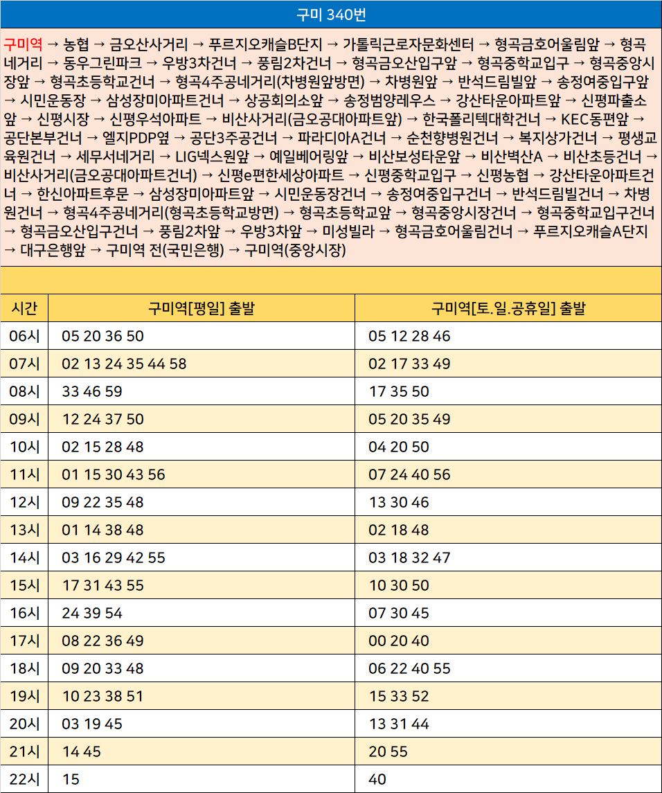 구미 340번: 구미역 → 농협 → 금오산사거리 → 푸르지오캐슬B단지 → 가톨릭근로자문화센터 → 형곡금호어울림앞 → 형곡네거리 → 동우그린파크 → 우방3차건너 → 풍림2차건너 → 형곡금오산입구앞 → 형곡중학교입구 → 형곡중앙시장앞 → 형곡초등학교건너 → 형곡4주공네거리 → 차병원앞 → 반석드림빌앞 → 송정여중입구앞 → 시민운동장 → 삼성장미아파트건너 → 상공회의소앞 → 송정범양레우스 → 강산타운아파트앞 → 신평파출소앞 → 신평시장 → 신평우석아파트 → 비산사거리 → 한국폴리텍대학건너 → KEC동편앞 → 공단본부건너 → 엘지PDP옆 → 공단3주공건너 → 파라디아A건너 → 순천향병원건너 → 복지상가건너 → 평생교육원건너 → 세무서네거리 → LIG넥스원앞 → 예일베어링앞 → 비산보성타운앞 → 비산벽산A → 비산초등건너 → 비산사거리 → 신평e편한세상아파트 → 신평중학교입구 → 신평농협 → 강산타운아파트건너 → 한신아파트후문 → 삼성장미아파트앞 → 시민운동장건너 → 송정여중입구건너 → 반석드림빌건너 → 차병원건너 → 형곡4주공네거리 → 형곡초등학교앞 → 형곡중앙시장건너 → 형곡중학교입구건너 → 형곡금오산입구건너 → 풍림2차앞 → 우방3차앞 → 미성빌라 → 형곡금호어울림건너 → 푸르지오캐슬A단지 → 대구은행앞 → 구미역 전 → 구미역