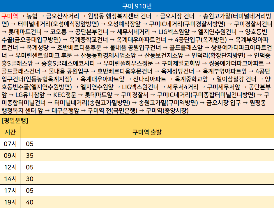 구미 910번: 구미역 → 농협 → 금오산사거리 → 원평동 행정복지센터 건너 → 금오시장 건너 → 송원고가밑 → 터미널네거리 → 오성예식장앞 → 구미IC네거리 → 구미경찰서건너 → 롯데마트건너 → 코오롱 → 공단본부건너 → 세무서네거리 → LIG넥스원앞 → 엘지연수원건너 → 양호동빈수골 → 옥계중학교건너 → 옥계대우아파트건너 → 4공단입구 → 옥계부영아파트건너 → 옥계성당 → 호반베르디움후문 → 물내음 공원입구건너 → 골드클래스앞 → 쌍용예가더파크아파트건너 → 우미린센트럴파크 후문 → 산동농협경제사업소앞 → 산동보건지소앞 → 인덕리 → 인덕중흥S클래스앞 → 중흥S클래스에코시티 → 우미린풀하우스정문 → 구미제일교회앞 → 쌍용예가더파크아파트 → 골드클래스건너 → 물내음 공원입구 → 호반베르디움후문건너 → 옥계성당건너 → 옥계부영아파트앞 → 4공단입구건너 → 옥계대우아파트앞 → 신나리아파트 → 옥계중학교앞 → 일이삼철강 건너 → 양호동빈수골 → 엘지연수원앞 → LIG넥스원건너 → 세무서4거리 → 구미세무서앞 → 공단본부앞 → LG유니참앞 → KEC정문 → 롯데마트앞 → 구미경찰서 → 구미IC네거리 → 구미종합터미널건너 → 터미널네거리 → 송원고가밑 → 금오시장 입구 → 원평동 행정복지 센터 앞 → 대구은행앞 → 구미역 전 → 구미역