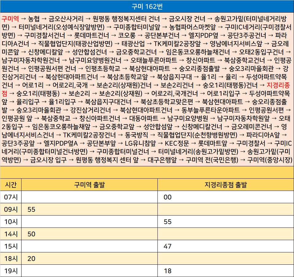 구미 162번: 구미역 → 농협 → 금오산사거리 → 원평동 행정복지센터 건너 → 금오시장 건너 → 송원고가밑 → 터미널네거리 → 구미종합터미널앞 → 농협파머스마켓앞 → 구미IC네거리 → 구미경찰서건너 → 롯데마트건너 → 코오롱 → 공단본부건너 → 엘지PDP옆 → 공단3주공건너 → 파라디아A건너 → 직물협업단지 → 태광산업 → TK케미칼2공장앞 → 영남에너지서비스앞 → 금오레미콘앞 → 신창메디칼앞 → 성안합섬건너 → 금오중학교건너 → 임은동코오롱하늘채건너 → 오태2동입구건너 → 남구미자동차학원건너 → 남구미요양병원건너 → 오태늘푸른아파트 → 창신아파트 → 북삼중학교건너 → 인평공원건너 → 인평공원서편 건너 → 인평초등학교 → 북삼현대아파트 → 숭오리종점출발 → 숭오3리마을회관 → 강진삼거리건너 → 북삼현대아파트건너 → 북삼초등학교앞 → 북삼읍지구대 → 율1리 → 율리 → 두성아파트약목건너 → 어로1리 → 어로2리,국개 → 보손2리건너 → 보손2리건너 → 숭오1리건너 → 지경리종점 → 숭오1리 → 보손2리 → 보손2리 → 어로2리,국개건너 → 어로1리입구 → 두성아파트약목앞 → 율리입구 → 율1리입구 → 북삼읍지구대건너 → 북삼초등학교맞은편 → 북삼현대아파트 → 숭오리종점출발 → 숭오3리마을회관 → 강진삼거리건너 → 북삼현대아파트건너 → 동부늘푸른타운아파트 → 인평공원서편 → 인평공원 앞 → 북삼중학교 → 창신아파트건너 → 대동아파트 → 남구미요양병원 → 남구미자동차학원앞 → 오태2동입구 → 임은동코오롱하늘채앞 → 금오중학교앞 → 성안합섬앞 → 신창메디칼건너 → 금오레미콘건너 → 영남에너지서비스건너 → TK케미칼2공장건너 → 동국방직 → 직물협업단지 → 파라디아A앞 → 공단3주공앞 → 엘지PDP옆A → 공단본부앞 → LG유니참앞 → KEC정문 → 롯데마트앞 → 구미경찰서 → 구미IC네거리 → 구미종합터미널건너 → 터미널네거리 → 송원고가밑 → 금오시장 입구 → 원평동 행정복지 센터 앞 → 대구은행앞 → 구미역 전 → 구미역