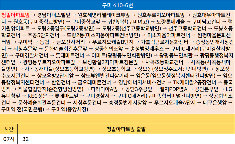 구미 410-6번: 청솔아파트앞 → 경남아너스빌앞 → 원호세영리첼레이크뷰앞 → 원호푸르지오아파트앞 → 원호대우아파트건너 → 원호동 → 구미중학교앞 → 귀빈맨션 → 도량롯데캐슬 → 구미남고건너 → 럭키원앙아파트 → 도량2동입구 → 도량2동 → 선주고등학교건너 → 도봉초등학교건너 → 주공5단지건너 → 도량2동 → 미소지움아파트건너 → 원평마을문화센터앞 → 구미역 → 농협 → 금오산사거리 → 푸르지오캐슬B단지 → 가톨릭근로자문화센터 → 송정동번개시장건너 → 시청후문앞 → 문화예술회관후문앞 → 상공회의소앞 → 송정범양레우스 → 구미IC네거리 → 구미경찰서건너 → 롯데마트건너 → 이마트 → 광평동노인회관 → 광평동행정복지센터앞 → 광평동푸르지오아파트앞 → 보성황실2차아파트정문앞 → 사곡초등학교건너 → 사곡동 → 사곡동새마을 → 상모초등학교 → 상모동 → 상모정수도서관건너 → 상모우방2단지앞 → 삼도뷰앤빌건너삼거리 → 임은동 → 임오동행정복지센터건너 → 한염건너 → 금오레미콘건너 → 영남에너지서비스건너 → TK케미칼2공장건너 → 동국방직 → 직물협업단지 → 파라디아A앞 → 공단3주공앞 → 엘지PDP옆A → 공단본부앞 → LG유니참앞 → KEC정문 → 롯데마트앞 → 구미경찰서 → 구미IC네거리 → 상공회의소건너 → 문화예술회관후문건너 → 시청후문건너 → 송정동번개시장앞 → 푸르지오캐슬A단지 → 대구은행앞 → 구미역 전 → 구미역