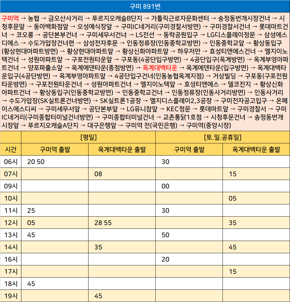 구미 891번: 구미역 → 농협 → 금오산사거리 → 푸르지오캐슬B단지 → 가톨릭근로자문화센터 → 송정동번개시장건너 → 시청후문앞 → 동아백화점앞 → 오성예식장앞 → 구미IC네거리 → 구미경찰서건너 → 롯데마트건너 → 코오롱 → 공단본부건너 → 구미세무서건너 → LS전선 → 동락공원입구 → LG디스플레이정문 → 삼성에스디에스 → 수도가압장건너편 → 삼성전자후문 → 인동정류장 → 인동중학교앞 → 황상동입구 → 황상현대아파트앞 → 황상신화아파트앞 → 하우저만 → 효성티앤에스건너 → 엘지이노텍건너 → 성원아파트앞 → 구포전원타운앞 → 구포동 → 4공단입구 → 옥계부영아파트건너 → 양포파출소앞 → 옥계에덴타운 → 옥계대백타운 → 옥계에덴타운 → 옥계대백타운입구 → 옥계부영아파트앞 → 4공단입구건너 → 거상빌딩 → 구포동 → 구포전원타운건너 → 성원아파트건너 → 엘지이노텍앞 → 효성티앤에스 → 델코전지 → 황상신화아파트건너 → 황상동입구 → 인동중학교건너 → 인동정류장 → 인동사거리 → 수도가압장 → SK실트론1공장 → 엘지디스플레이2,3공장 → 구미전자공고입구 → 온페이스에스디씨 → 구미세무서앞 → 공단본부앞 → LG유니참앞 → KEC정문 → 롯데마트앞 → 구미경찰서 → 구미IC네거리 → 구미종합터미널건너 → 교촌통닭1호점 → 시청후문건너 → 송정동번개시장앞 → 푸르지오캐슬A단지 → 대구은행앞 → 구미역 전 → 구미역